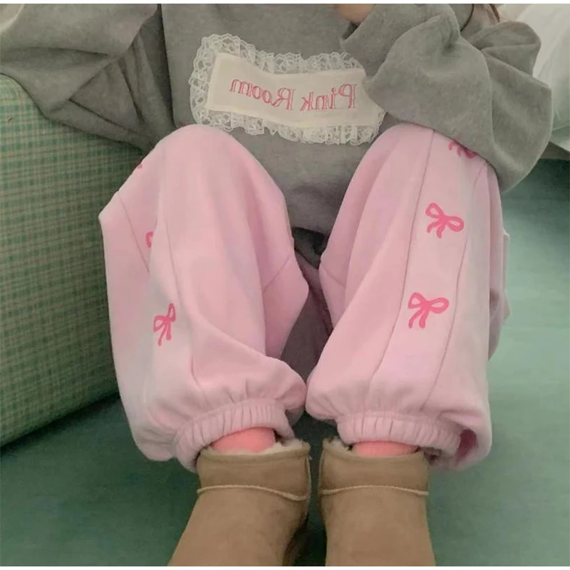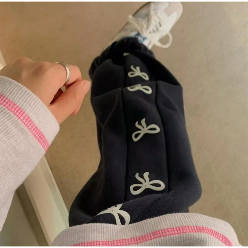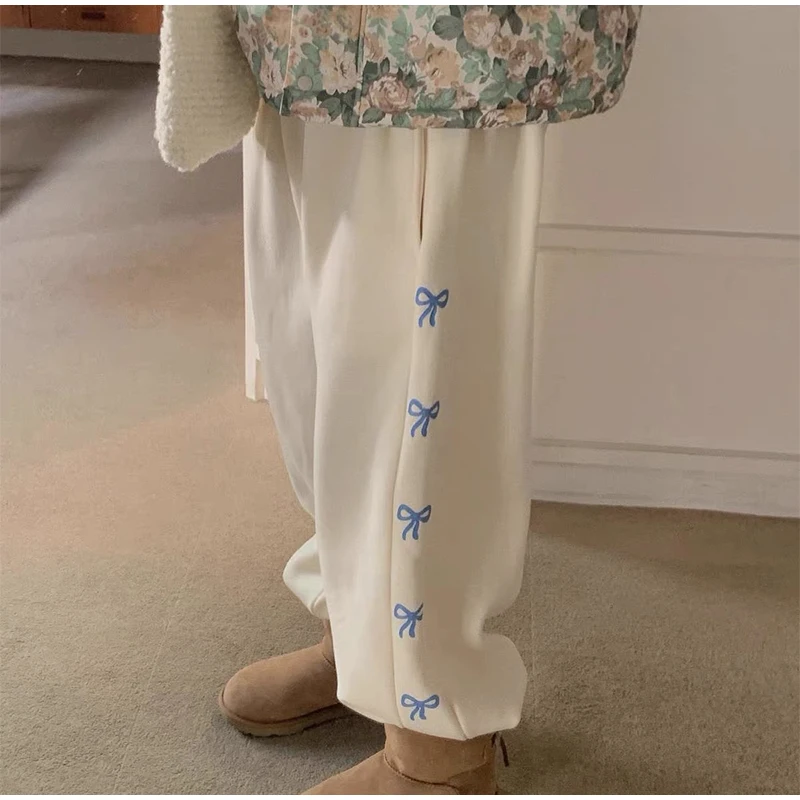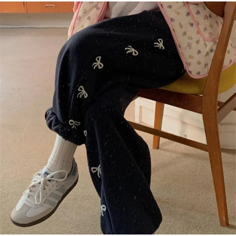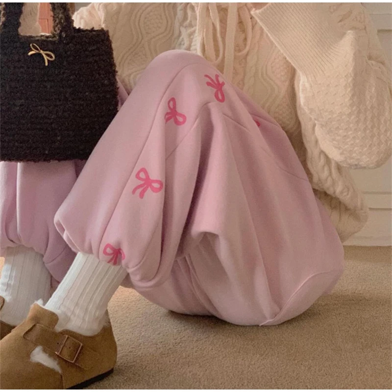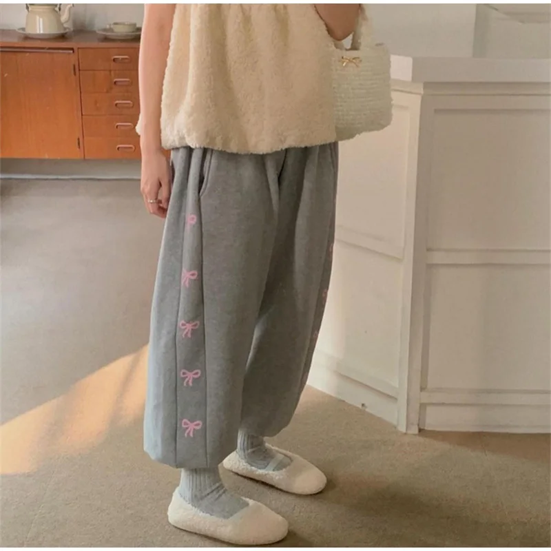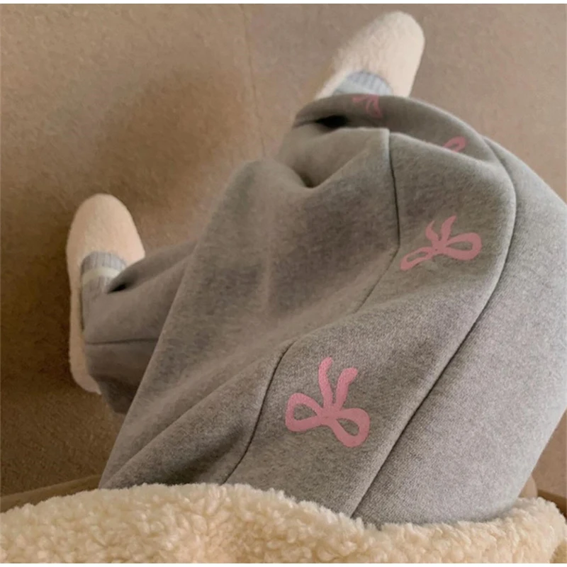 Bow Print Plus Velvet Sweatpants Women Elastic Waist Loose Pockets Warm Casual Trousers Female Winter Autumn Soft Lady Joggers