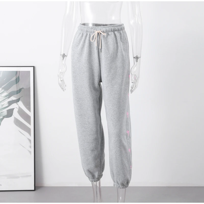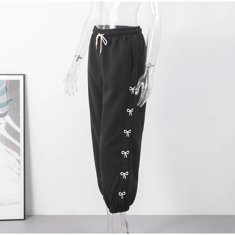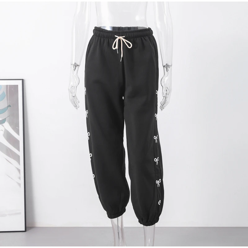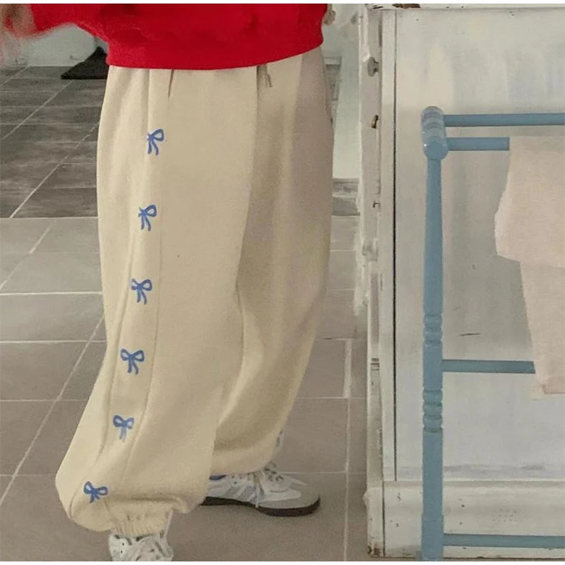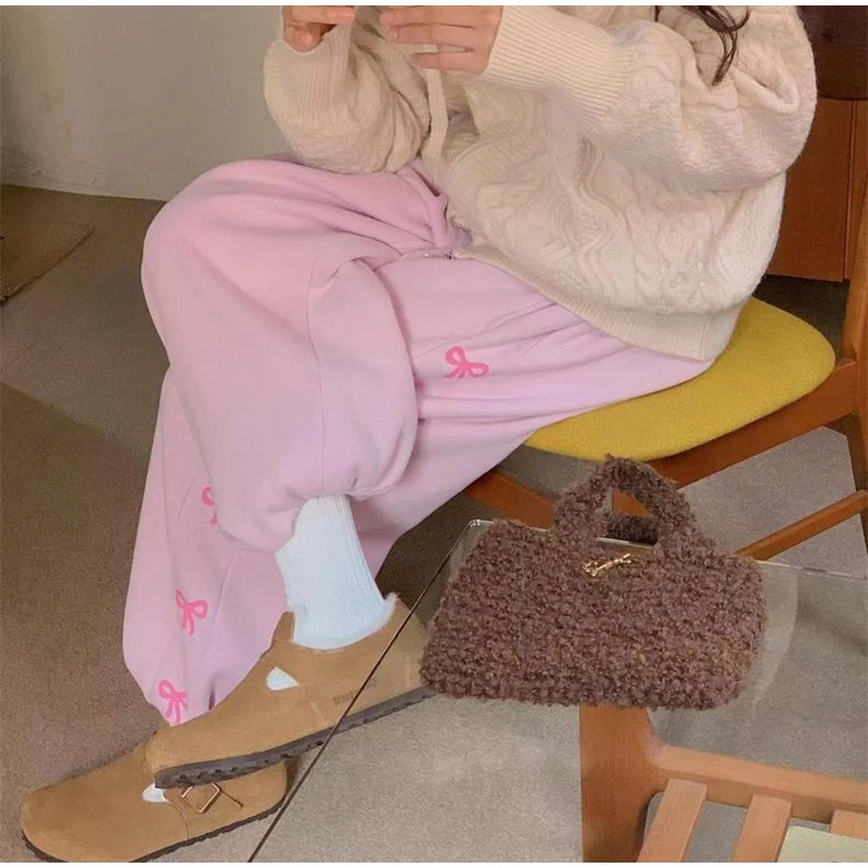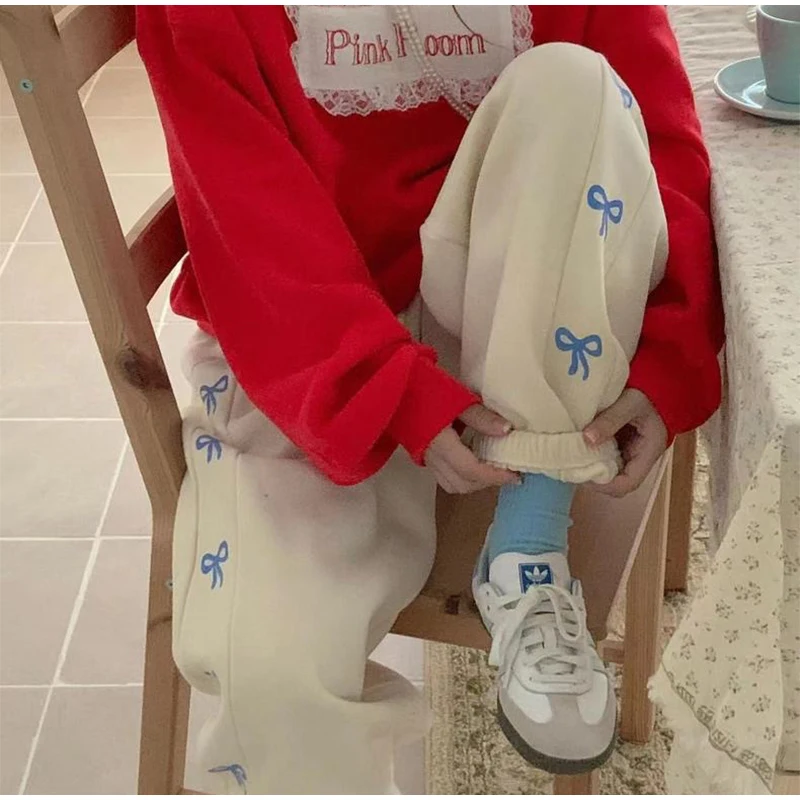 Bow Print Plus Velvet Sweatpants Women Elastic Waist Loose Pockets Warm Casual Trousers Female Winter Autumn Soft Lady Joggers