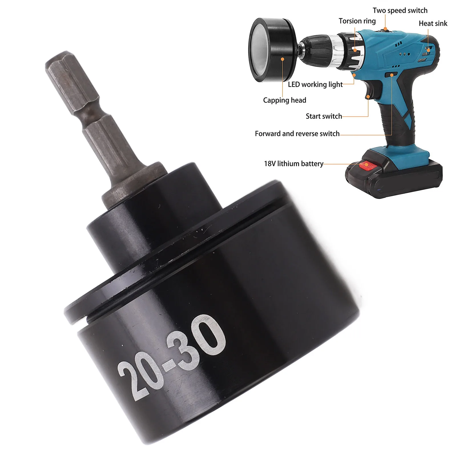 1. Cap Handling: This capping head works with electric cap sealing machine, can easily tighten, loosen or rotate various nut caps, saves effort, improves efficiency.2. For 20mm to 30mm: The capping head is specially designed for caps with a diameter of 20 to 30mm, very functional and practical.
