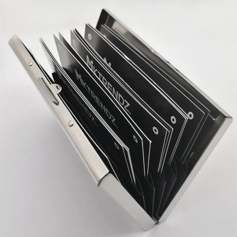 The minimalist design of the card holder emphasizes functionality without sacrificing aesthetic appeal. The compact size and lightweight nature of the aluminum ensure comfort and convenience when carried in a pocket or purse. The precise arrangement of card slots within the holder allows for the secure storage of multiple cards without compromising ease of access. Users can effortlessly withdraw desired cards by opening the device with a simple, secure mechanism. This facilitates fluid card retrieval while maintaining the safekeeping of all cards contained within.