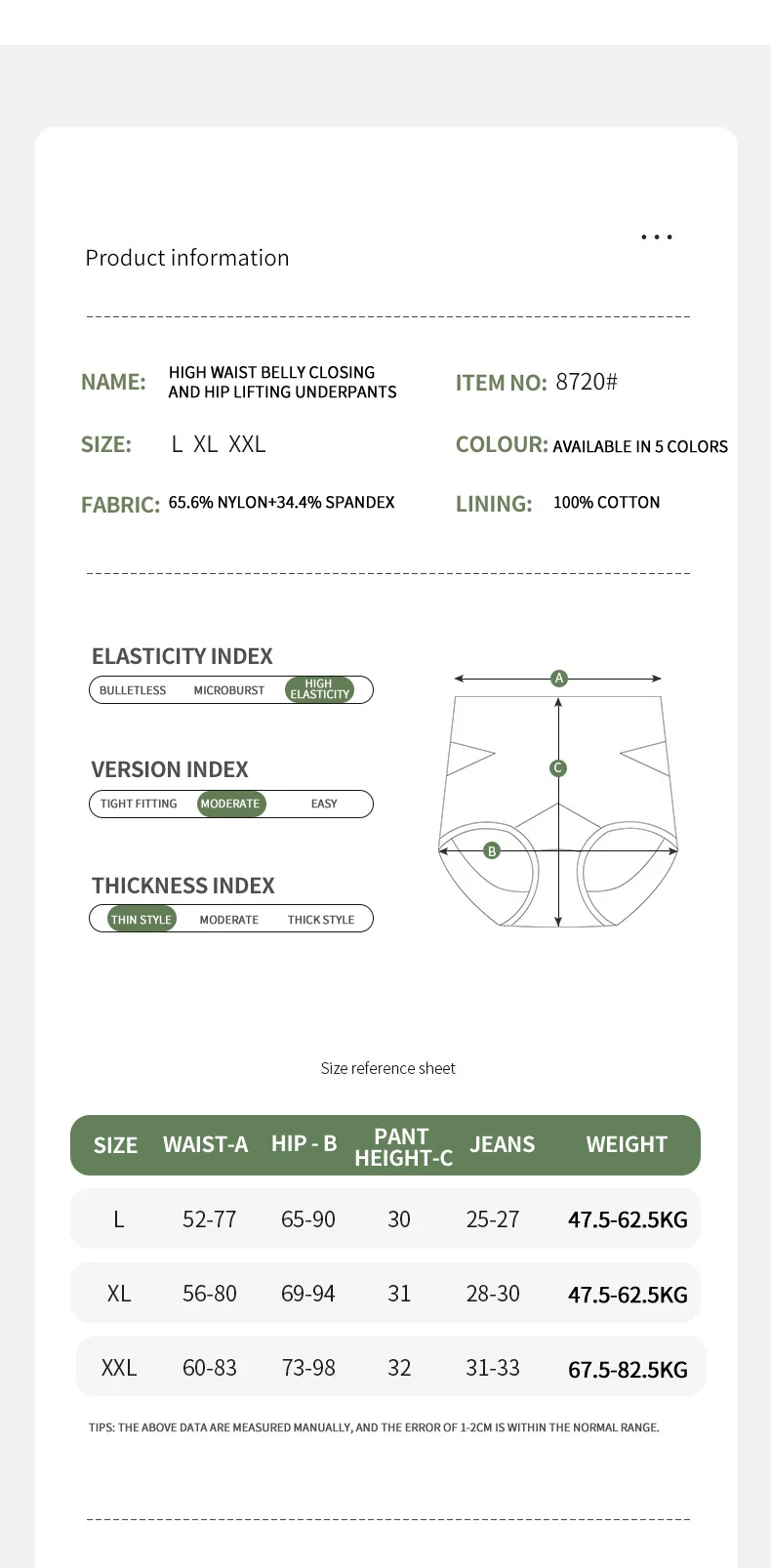 Size and Fit: The product is available in sizes Large, X-Large, and XX-Large. Specifications detailing waistline, hip circumference, length, and suitable weight ranges meticulously guide customers in selecting the appropriate size. This precision is vital for ensuring a proper fit and desired effect.