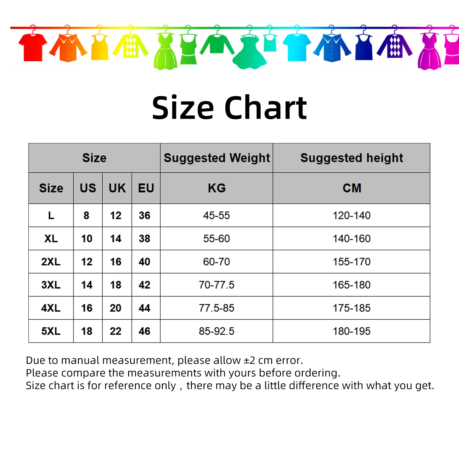 There are multi sizes for your choice: L, XL, 2XL, 3XL, 4XL, 5XL.