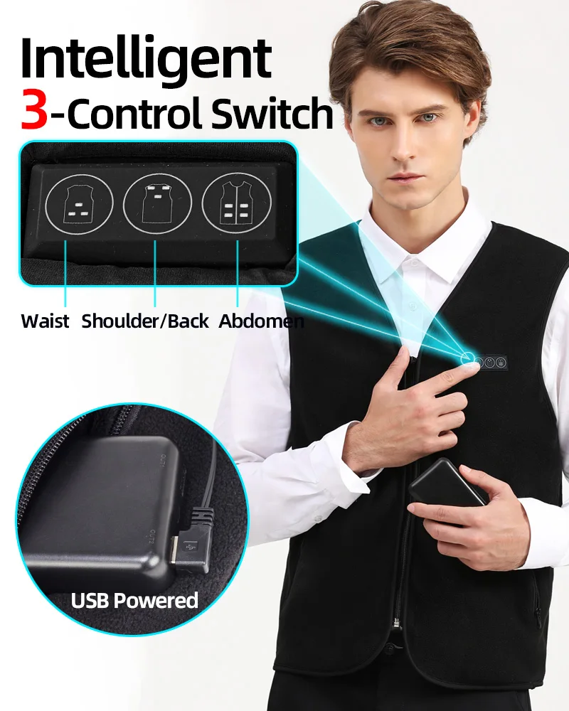 The Vest Is Equipped With 10 Built-in Heating Zones, Including The Shoulders (3), Waist (3), And Abdomen (4), To Effectively Keep